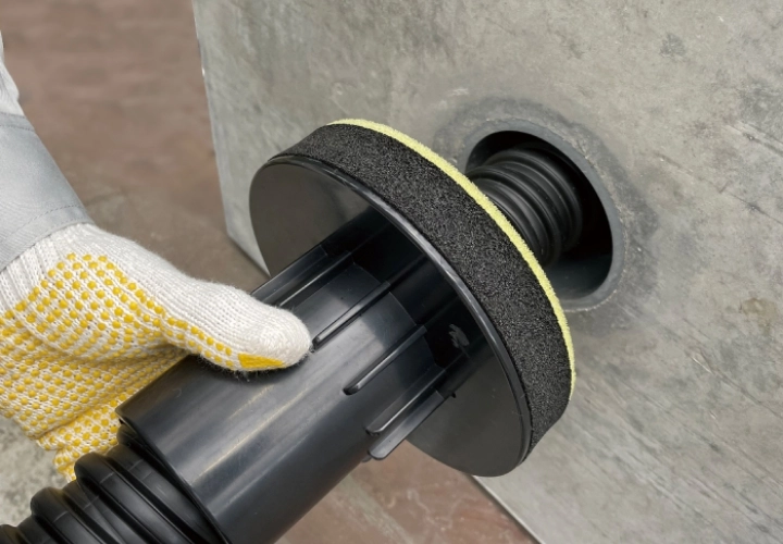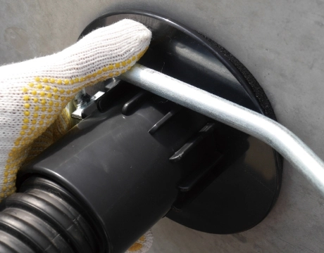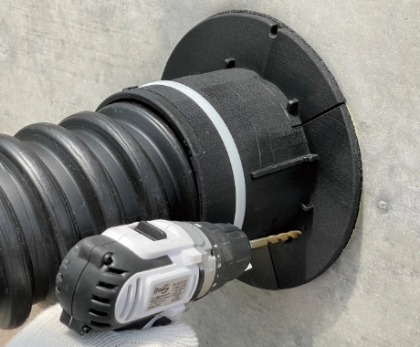 仕上げに外側からフランジにある刻印マークにドリルで穴を開けてコーキング材の注入が必要です。