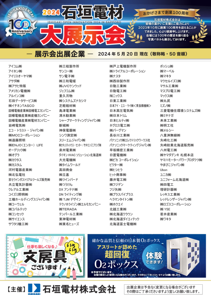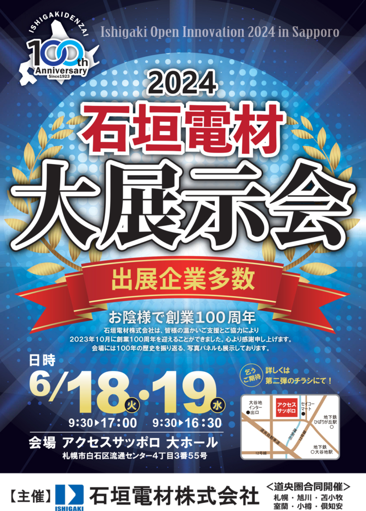 2024年6月18日(火)・19日(水)にアクセスサッポロで開催される「2024年度 石垣電材大展示会」に出展いたします。